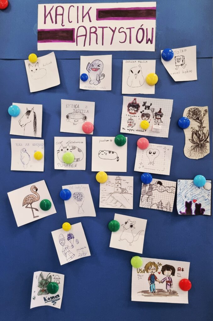 Zachęcam całą społeczność szkolną do odwiedzenia wystawy oraz aktywnego korzystania z nowo powstałego „Kącika artystów”. Jest on dostępny dla wszystkich codziennie w godzinach otwarcia biblioteki. Zawiera już dwadzieścia jeden prac uczniów. To przestrzeń, w której każdy może odkryć w sobie artystę!